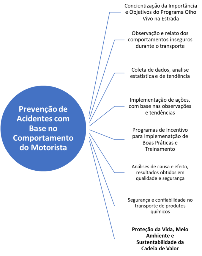 O programa “Olho vivo na estrada” tem como objetivo prevenir acidentes no transporte rodoviário de produtos químicos, por meio da conscientização dos motoristas sobre a importância do comportamento humano no trânsito. A iniciativa faz parte de um sistema de gerenciamento de riscos na qual a meta é a redução à zero no número de acidentes nas estradas envolvendo o transporte de produtos químicos.